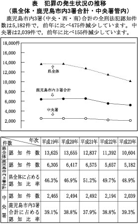 鹿児島県警察では,これまで,地域住民,自治体,関係機関・団体との協働による「犯罪を起こさせない・犯罪の起きにくい社会づくり」に取り組んでまいりました。その結果,県下では,ほとんどの自治体で「安全・安心まちづくり条例」が制定されたほか,県内各地で自主防犯ボランティア団体や青パト隊が結成され,自主的な防犯活動が活性化するなど県民の防犯意識の高まりが見られ,刑法犯認知件数は平成22年に戦後最少を記録し,平成23年もこれを更に更新するなど,いわゆる「指数治安」については一定の改善が見られるところです。