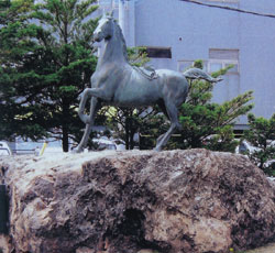 早速中隊本部跡を訪問した(写真2)。昔のままに良く保存されていて,館長さんの厚意で内部を詳しく見せて貰った。私がかつて感動した屯田兵士家族の土間も竈も農機具も,ここ中隊本部の館内に移築し保存されていた。私は懐かしい知人と久し振りにあったような気がした。しかし,残念ながら私はこれらが鉄筋の中でなく,野晒し農地に建っていた姿を見たかった。記念館の周囲には開拓時代の幹回り3m以上のナラ,クヌギ等の巨木の森林を開き,農地を耕す兵士の苦労の姿がセピア色の古い写真やパネルで展示されていた。私はつい屋久島開拓と霧島御池開墾の姿を重ね合わせて思うことだった。庭に出て見ると逞しく若々しい兵士の銅像が建っており(写真3),その脇には凛々しく奮い立つ農耕馬の銅像もあった(写真4)。当時荒地の開墾に馬の力は今のブルドーザー以上に欠かせない大事な存在だったのだ。何よりも互いに温かい血が通っていたことだろう。「拓魂」と記銘した誠に大きな自然石碑もあった(写真5)。当時の人たちの気合が伝わってきた。