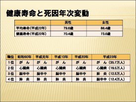 健康寿命とは,日常的に介護を必要としないで,自立した生活ができる生存期間のことをいいますが,今年の厚生労働省の発表によると,日本人の健康寿命はスライドに示すとおりで,平均寿命との差,男性9年余,女性12年余は,病気などのために自立した生活ができない期間があることを意味しています。なお,鹿児島県の健康寿命は,男性71.1歳,女性74.5歳と全国平均を上回ってはいます。