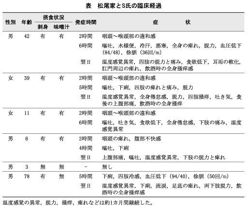 などがある。その中でも特にシガテラに特徴的なものとして“ドライアイスセンセーション”というものがある。水など常温以下の液体に触れたとき,あたかもドライアイスに触れたときのような温度感覚異常をきたすというものである。食べた魚の種類とこのドライアイスセンセーションの有無でシガテラは診断できると考えている。実際私が体験したドライアイスセンセーションは,水や冷たい飲み物を口に含んだ際に,強い炭酸を飲んだときのように口から喉がシュワシュワ,ピリピリしたり,手を洗った際には,水に触れているところだけがヒリヒリ,ビリビリするというもので,どちらかというと“痛み”であった。その代わり温かいお茶や風呂はどうもなかった。冬に静電気が嫌でドアノブに触りたくないのと同じで水に触れたくなかった。そのドライアイスセンセーションが1カ月も続くのである。ビールいらずの日々は続いたが,手を洗う度にビリビリするのには家族全員辟易した。私の家族とS氏の実際の症状に関しては表の通りであった4)。