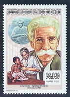 切手にシュバイツァーの肖像,メダル,診察する医師を描く