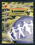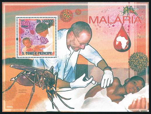 シート地:男子に注射する医師とアフリカ地図を配する血液の滴とマラリア媒介ステフェンスハマダラカ