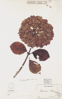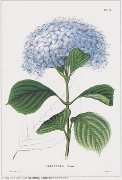 彼はこれを出島の植物園で「オタクサ」の名で愛でながら栽培していたそうな。学名の形容語に用いられている「otaksa」はラテン語にはなく,大輪ながら可憐なこの紫陽花に,愛妻の名を献じたものと思われる。なんと麗しいはなしではないか。