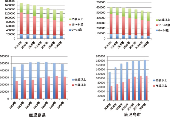 表1に示すようにDPC対象病院の退院件数の58%を,鹿児島保健医療圏で占めています。がん,心筋梗塞,脳卒中の3疾患についてみると,救急対応を要する心筋梗塞の場合,退院件数の約60%を鹿児島保健医療圏のDPC対象病院が占めるものの,肝属保健医療圏や出水保健医療圏のDPC対象病院も10%以上の件数を占めています。一方,治療開始まで比較的余裕のあるがんの場合,73%を鹿児島保健医療圏のDPC対象病院で占めており,他の保健医療圏のDPC対象病院の占める割合は,10%未満です。脳卒中はこの中間くらいとなっています。DPC対象病院の多くが鹿児島保健医療圏に集中していること,曽於保健医療圏にはDPC対象病院がないことなど,このデータが鹿児島県の急性期医療全体を反映しているとは言えませんが,県内の急性期医療の対象患者のかなりの部分が,鹿児島医療圏の病院に集中していることを示しているデータと思います。また図2に示しますように,高齢化が進んでいる鹿児島県全体に比べ,鹿児島市では今後高齢化の問題が顕著となってくることが予想されます。鹿児島保健医療圏以外の保健医療圏では患者数は徐々に減少していくのに対して,鹿児島保健医療圏では,高齢化の進行とともに循環器,脳卒中,がんの患者さんの増加に加え,高齢化に伴う呼吸器疾患(誤嚥性肺炎),整形疾患(転倒・転落による骨折など),認知症の患者さんの増加も予想されます。NHKスペシャルの中で取り上げられたことが,鹿児島でも同じ問題となってきます。国の医療政策も大きな転換期を迎えようとしています。県民への周知,医療連携のみでなく介護を含めた地域連携など,鹿児島県全体で取り組んでいかねばならない時期にきていると思います。