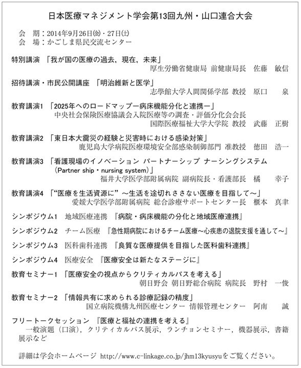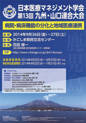 このような時期に,日本医療マネジメント学会第13回九州・山口連合大会を当院でお世話することになりました。日本医療マネジメント学会(理事長 宮ア久義 国立病院機構熊本医療センター名誉院長)は,医療マネジメント手法の開発と普及をはかり,医療の質の向上に寄与することを目的として1999年に発足し,クリティカルパス,医療安全,医療事故,地域連携,医療経営など医療現場に向き合った学会で,病院関係者全てを対象とした学会です。医師のみでなくコメディカルスタッフの参加も多く,1,500人規模の参加者が見込まれます。病床の機能分化・連携および在宅医療・在宅介護の推進への対応が,各医療機関に求められている折から,第13回連合大会のテーマは,「病院・病床機能分化と地域医療連携」といたしました。鹿児島県内の医療機関からなる学会実行委員の方々のご協力により,下記のようなプログラムが決定しています。今後の地域連携を考える機会となれば幸いと思います。皆様のご参加をお待ちしております。
