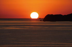 昨年10月,この講座の主催で撮影会があった。東京から第一線で活躍中の講師を招き,1日バスを借り切って出水のコスモスと武家屋敷,それに長島の夕日を撮りにいったのである。現地に着くまでの車中では,撮影のポイント等について講義がありこれも大変有意義であった。現地の天気は最高で,特に長島の夕日は雲ひとつない状況で,「少しくらい雲があった方がいいのに」というような贅沢な声も聞こえるほど素晴らしい撮影環境に恵まれた。海岸に60台もの三脚がずらりと並んでいる姿は壮観で,みんな,水平線に沈んでいく太陽の感動的な瞬間を逃すまいと必死にシャッターを切り続けていた。青空がだんだんと茜色に染まりだし,海面も赤くキラキラと輝く。太陽が水平線に近づくにつれ逆ワイングラスになったかと思うとあっという間に吸い込まれていく。そして,その後の水平線と空が一体になった色の素晴らしさ。感動の瞬間であった。