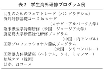 できるだけ多くの学生に海外での研修の機会を与えることを目的として,共通教育カリキュラムとして,“学生海外研修プログラム”を実施しています。引率教員の綿密な企画とスケジュール管理の中で実施され,平成25年度は28のコースに約300人の学生が参加しました。ほとんどのコースが夏期,冬期,春期の休暇時に1〜4週間の短期間で実施され,学生達は専門性にかかわらずどのコースにも参加できます。コース参加者に対しては渡航事前指導と事後学習が組まれ,特に事後学習では,英語コミュニケーション力の継続的学習とグローバル・イニシアチブ講義がセットされています。また,コース参加者に対しては,学長裁量経費から旅費の一部が支給されます。いくつかのコース事例を以下に紹介します(表2)。