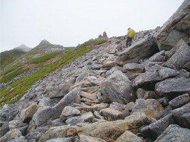 食堂にあったストーブでずぶ濡れになった手袋や雨具を乾かし,朝食の残りのおにぎりを食べ小雨になるのを待った。そしてお昼すぎに出発したが常念小屋までの残り2.4キロは途中,東天井岳(2,814m),横通岳(2,767m)をトラバースしながらの登行となった。常念小屋は樹林帯を過ぎたところにあった。