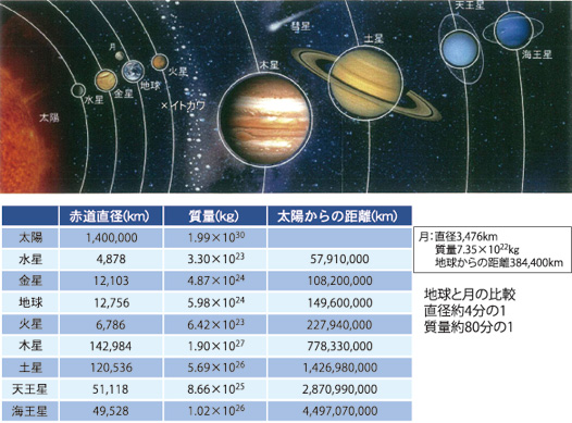 恒星たる太陽を中心にこれを廻る8の惑星があり,水星,金星とつづき3番目に近いのが我々の豊かなる地球なのである。近いといっても1億4千960万キロ,文字どおり天文学的数字の距離をもつ。ちなみに最も遠いのは海王星で,44億9千万余キロ,気の遠くなるような距離をもつ太陽系と言われ,まさに宇宙規模と言われる(図をご参照ください)。