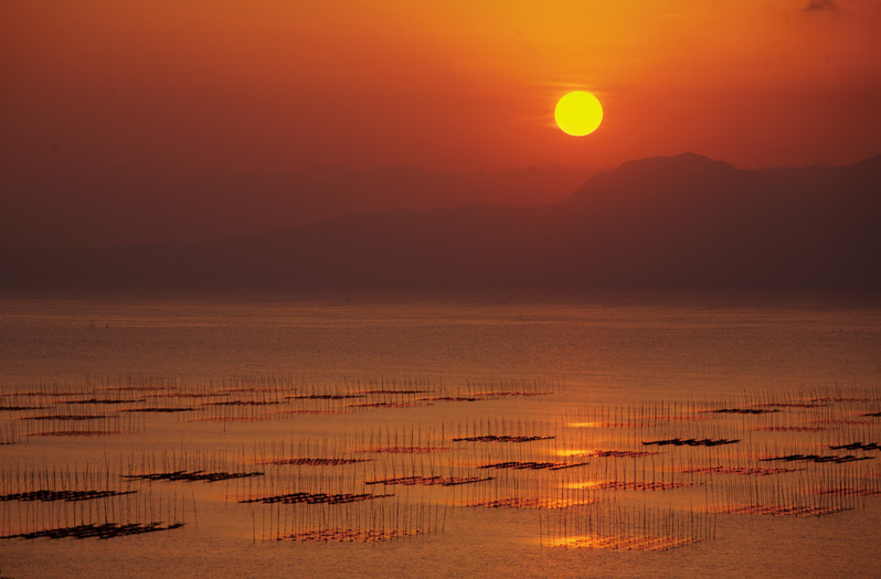 冬の空気は澄み,夕日が雲仙に隠れる頃には海は橙色にやけ,整然と並んだノリ養殖の支柱も夕日を受け,その幾何学模様も映えて見飽きない。 撮影場所:熊本市西区・有明海