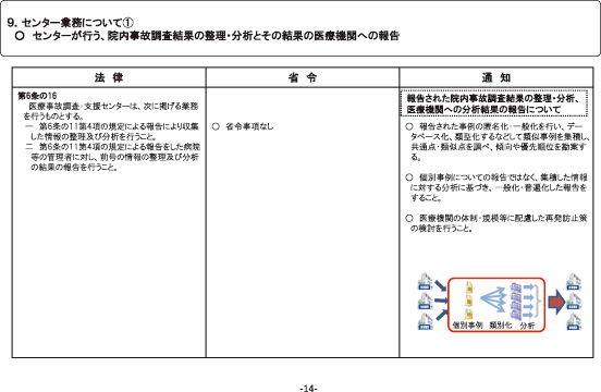センターの主な業務は,院内事故調査結果の整理・分析,医療機関への分析結果の報告である。この報告は個別事例の報告ではなく,集積した情報を一般化・普遍化した報告である。図2のごとく,個別事例を類型化・分析して全医療機関に報告するものである。