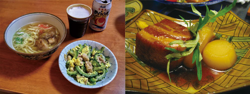 左からソーキそば,ゴーヤチャンプルー,ラフテー(沖縄郷土料理)