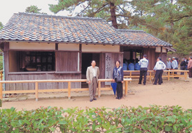 ここから東に移動して松下村塾に行ってみると,団体観光客が大勢詰めかけているので驚いた。ガイドさんが長々と説明を終えると次の団体と入れ替わるという具合で,随分待ってからやっと写真を撮ることができた(写真5)。部屋の中には上がれない規則だが,特別に許可を得たのか揃いの服を着た10数人が中に座って講義を聴いていた。隣には1855年松陰が3畳の部屋に蟄居を命ぜられた杉家があり,松下村塾とともに世界遺産に登録されている。