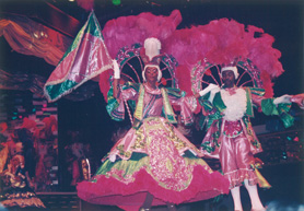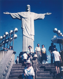 山を下りてから劇場に移動して,お楽しみのサンバ・ショーをみた。カーニバルの時のような豪華絢爛な衣装の踊り子や(写真13),グラマーなダンサー達が踊ったり,数名の男性ダンサーが舞台いっぱい,白井健三ばりの空中回転をして見せてくれたりした。観客も世界中からきており,最後は国別に舞台に上がって歌をうたうことになり,我々10数人の日本チームは「上を向いて歩こう」を選んだ。この歌はスキヤキ・ソングとして世界中に知られているので伴奏もつき,力いっぱい歌ったら拍手喝采を浴びて嬉しかった。興奮冷めやらぬまま,楽しかった一日に満足してホテルへの帰途についた。