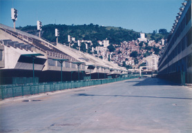 イパネマからUターンしてコパカバーナ海岸を通り過ぎ,セントロ地区に達した。リオのカーニバルはA級とB~C級に分かれて踊るのだが,10数組あるA級には順位を決めるため,この地区にはサンボードロモと呼ばれる専用の会場が用意されている。幅10数m,長さ700mのひょろ長い空間で,右側の一部に3階建ての学校の校舎が建ち,反対側は階段状の審査員・観客席になっており,カーニバル当日は激しいサンバの踊りが展開される。その時は学校も解放され,窓を外して大勢の観客が応援するのだという(写真6,7)。