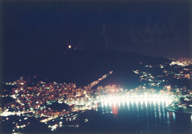 “砂糖パン”の山は高さ390mで夜景を見に,暗くなってからケーブルで頂上に登った。天空にはライトアップされたキリスト像が輝いており,同じ間隔で光っているのはマラソンが行われたフラメンゴ海岸である(写真12)。ランナーはこの海岸道路を3往復してからゴールに向かうので,“砂糖パン”の山を3回見ることになる。