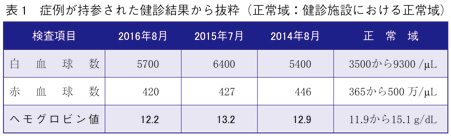 病 歴:健診で正常(表1),TVで見聞きした「かくれ貧血」の検査を希望。