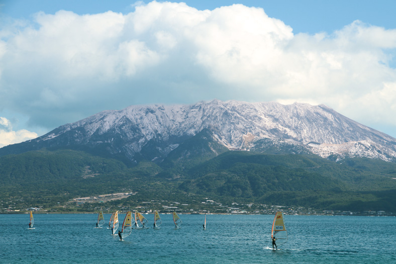 冠雪の桜島,波静かな錦江湾。 15,6人の若者たちが海上で練習をくり返していた。