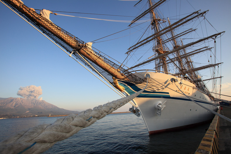 独立行政法人海技教育機構が保有する帆船日本丸 {昭和59年9月12日完工全長110.09m,総トン2,570トン,最大乗組員190人(実習生120人),速力最大14.33/巡航13.20ノット,女子実習生専用の衛生設備あり} が鹿児島港には時々入港します。7月は海の日もあり勇壮なこの帆船を取り上げてみました。桜島とコラボでいい場面が見られます。この次は日本丸が10月28日〜11月2日,海王丸が1月24日〜28日まで鹿児島港に寄港します。