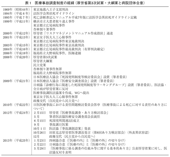 福島県立大野病院事件,東京女子医大人工心肺事件の無罪判決,死因究明2法への流れのなかで,第3次試案・大綱案はパブリックコメントに付されたまま店晒しとなり,医療事故調査制度問題は終息したかに見えたが,2012年(平成24年),再び,死因究明制度議論が動き出したのである。