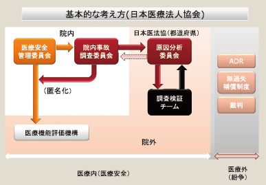 この合意の基本的な考え方は,「院内医療事故調査中心主義」言い換えれば,「当事者解決主義」であり,地方の第三者機関である院外医療事故調査検証委員会は,それを支援・バックアップする機関であるということを明示している。また,中央の第三者機関は,再発防止のための研究機関であり,事例収集や対策の研究等がその業務である。権威的組織であってはならないとともに,行政との関係があってはならないことは当然であろう。全体システムは,ボトムアップ型の解決システムと言える。今回出来上がった医療事故調査制度の基本フレームが日本医療法人協会原案・病院団体合意であることが理解いただけることと思う。大綱案とは基本構造が全く異なるのである。
