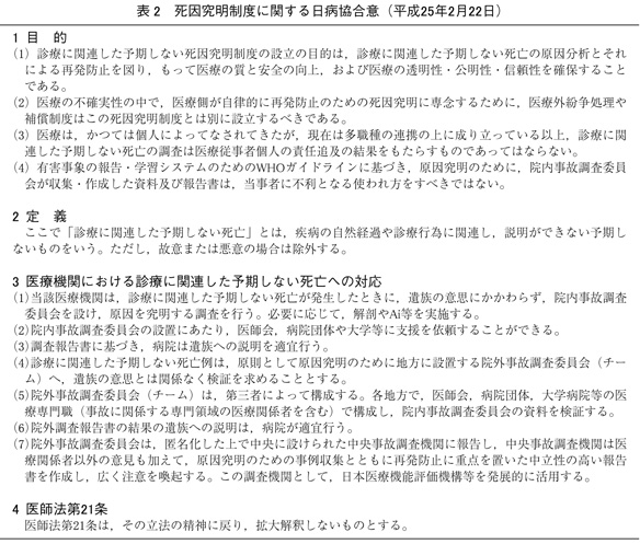 病院団体の合意は,責任追及を排除した,あくまでも「医療の内」に限定しての再発防止のためのシステム作りであり,医師法第21条の解釈を「外表異状」とすることを前提にしている。「医師法第21条は,その立法の精神に戻り,拡大解釈しないものとする。」と明記した。