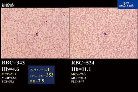 図1は来院時と治療27日後の末梢血液像です。来院時は典型的な鉄欠乏性貧血の末梢血液像,小球性低色素性です。