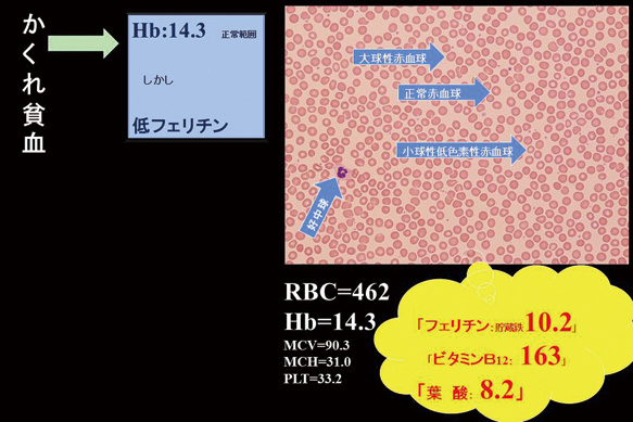 経過:血液生化学検査にて低フェリチン(10.2)と血色素(Hb:14.3)は正常である事から典型的な「潜在性の鉄欠乏」と診断。これは「かくれ貧血」とも呼ばれます。貧血治療指針1),2)によるとフェリチン値は12.0未満ですから治療対象です。ビタミンB12欠乏の自覚症状(鹿児島市医報,第56巻第7号,47ぺージを参照)を複数認め,ビタミンB12を検査したところ,163pg/mL(基準値180-914)と著明に低値。その後,鉄剤治療開始と同時にビタミンB12投与し,治療開始。1カ月後には体調回復しています。