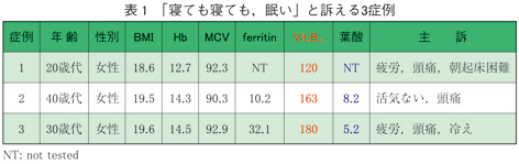 「寝ても寝ても,・・・」という訴えの症例で貧血は認めず,ビタミンB12欠乏が原因であった3症例を報告しました。