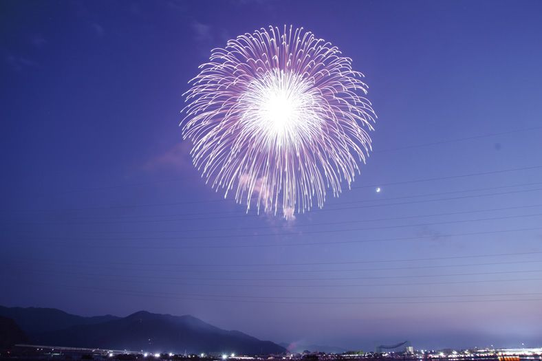 各地の花火も終わった10月中旬に,八代市球磨川河川緑地で開催される。 さわやかな秋の宵,約1万5000発の花火に30万人もの人が歓声をあげる。 カメラ:Canon EOS 5D MarkU