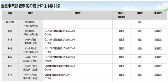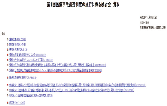 第1回医療事故調査制度の施行に係る検討会 2014年(平成26年)11月14日,厚労省第12会議室において,施行に係る検討会の第1回会議が開催された。医療関係・報道関係他数多くの傍聴者の中での,全面公開の検討会である。議事録も公開が予定されていた。日本医療法人協会医療事故調ガイドライン(現場からの医療事故調ガイドライン検討委員会最終報告書)(医法協案という)が検討資料として採用された(図3)。厚労科研費研究中間議論の整理も検討資料として採用されているが,これは,論点整理に留まるため,完成版である医法協案が中心となり,議論は進行して行った。筆者は,検討会のあらゆるメンバーから集中砲火を浴びることとなる。しかしながら,これは,裏を返せば,医法協案がたたき台になったということであり,医法協案を如何に修正するかのバトルとなった。筆者が戦場のど真ん中に一気に切り込んだため,不意を衝かれて,皆が,筆者を討ち取るべく集まって来て,一気に乱戦となったということである。当時の記録を基に,筆者の側から検討会の状況を振り返って記述したい。 第1回施行に係る検討会は,厚労省事務局から資料確認の後,橋本 岳政務官から挨拶があった。橋本 岳政務官は,自身の経験から,システムエンジニアリングの世界で言われるKISSの法則(Keep it simple and short(or small))を紹介し,システムは簡潔にコンパクトに造りなさいという教訓であると述べた。また,医療事故調査制度にも言及し,今回成立した医療法では,医療事故調査制度の目的はシンプルなものであること,この法律に基づいて,具体化するための検討をお願いしたいと明確な挨拶であった。 座長の選出に当たり,田邉 昇構成員(医師・弁護士)の意見書が紹介された。今回の座長は,第三次試案・大綱案時の関係者は不適任であるという意見であったが,結局,互選の結果,厚労省シナリオの通り,山本和彦構成員が座長に選出された。以下,議事録要約を記す。