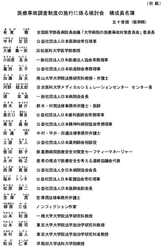 2014年(平成26年)10月27日,医療事故調査制度の施行に向けて,厚生労働省令,厚生労働大臣告示,通知などを策定するために,関係者の意見を聴取し反映させることを目的に,医政局長の私的諮問機関としての検討会が設置された。同年11月14日,「医療事故調査制度の施行に係る検討会」(以下,施行に係る検討会という)の第1回会議が開催され,これから翌年の2015年(平成27年2月25日)の第6回会議(最終回)まで,タイトな日程で,論戦が続いたのである(図1)。合意寸前であった施行に係る検討会は,最終回の第6回会議が大荒れに荒れて合意できない事態となった。結局,再度の会議を開くか否かも含めて調整することとなり,第6回会議後,厚労省の必死の調整が続いたのである。その結果,なんとか合意に達して,2015年(平成27年)3月20日,施行に係る検討会とりまとめ(「医療事故調査制度の施行に係る検討について」)が公表されることとなった。施行に係る検討会は医政局長の下に設置された検討会であるが,略,全過程,橋本 岳政務官,二川一男医政局長が出席するという異例の検討会であった。筆者は,施行に係る検討会に構成員として参加し,医法協案の説明を行った。今回,第1回の施行に係る検討会について記述したい。検討会の議事録全文は厚労省ホームページ(*)に掲載されているので,参照いただきたい。検討会構成員は図2に示す(図2)。 * http://www.mhlw.go.jp/stf/shingi/other-isei.html?tid=228657