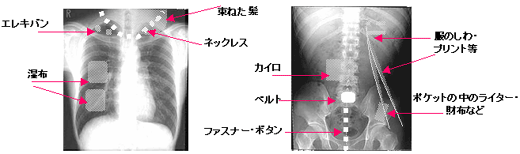 | 撮影部位によっては、ボタン・ネックレスなど写真に写り、診断に支障をきたすおそれ(重なってしまい病変がわからない、病変とまぎらわしいなど)のある場合、服を脱いでもらったり、湿布、エレキバン等をはずしてもらったりいたします。 |