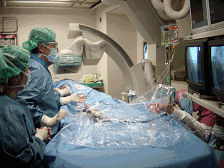 人間の生命活動を血液の循環を通じて支える心臓、そして血管。それだけに、心臓病は深刻な問題になります。現在では動脈硬化疾患である心疾患と脳血管障害が日本の死因の第2位、3位を占めています。 当院では、増加し続ける循環器疾患の治療部門において、医師、看護師、臨床検査技師、放射線技師が24時間体制で待機し、昼夜を問わず、対応しています。 心臓カテーテル検査は、大腿動脈もしくは肘動脈より血管造影用カテーテルを挿入し、冠動脈を撮影する事を目的としています。 造影の結果、狭窄部位が発見されれば、冠動脈血管内エコー(IVUS)検査により、その部位の治療の必要性を判断し、経皮的冠動脈形成術(PTCA)、冠動脈内ステント留置術