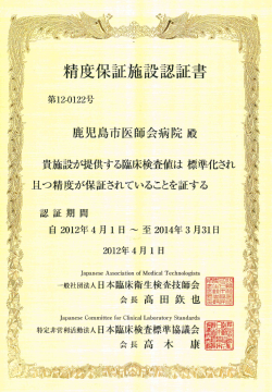当院は,この度,社団法人日本臨床衛生検査技師会から精度保証施設として認証を受けました。認証期間は,2012年4月1日から2014年3月31日までの2年間です。精度保証施設認証とは当院が提供する臨床検査値が標準化され且つ精度が保証されていることを認証するというものです。