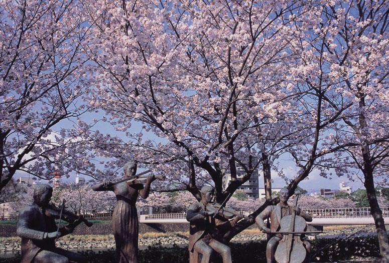 旧五大石橋のひとつ、武之橋のたもとにこの季節になると、ひときわ楽しげなグループがある。春風にのってとどくのはバロックか、生誕250年を祝うモーツァルトか。