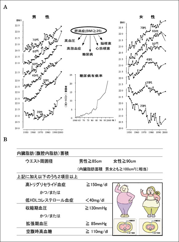 図1.日本人の体重(BMI)の年次推移(A:1950−2000)とメタボリックシンドロームの診断基準(B)