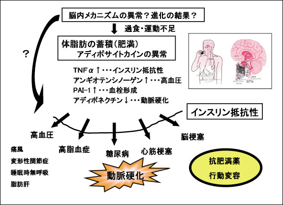 しかしながら、こういったレプチンの食欲、体重抑制作用が作動しない状態−レプチン抵抗性が、肥満病態に共通して認められることも明らかとなった。このことは、飢えとともに歩んできた人類の長い進化の歴史を考慮すると、食欲・体重調節機構の本態は肥満の制御にあるのではなく、むしろ飢えに応答10-12)することにあると理解されるようになった(倹約遺伝子仮説)。すなわち、進化の過程で獲得したことは、いかに体脂肪を蓄積するかということにあり、その結果、脂肪組織より放出されるアディポサイトカインの量的、質的変動を生じ、インスリン抵抗性、高血圧、血栓形成傾向や動脈硬化を招来すると考えられている(図3)。