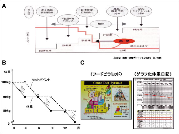 図4.食事療法のトランスセオレティカル・モデル(A)とセットポイント仮説(B)