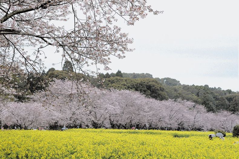 雨上がりの空の下、西都原古墳公園の桜と菜の花は満開であった。この公園は、特別史跡西都原古墳群の中央にある。桜並木の後方に見える森には、5世紀初頭に築造されたといわれる男狭穂塚(おさほづか、全国最大の帆立貝形前方後円墳、墳長154m)女狭穂塚(めさほづか、九州最大の畿内式前方後円墳、墳長176m)がある。例年、両塚と古墳公園に隣接した御陵墓前広場で、3月最終土曜日から「西都原桜・菜の花祭り」が開催される。