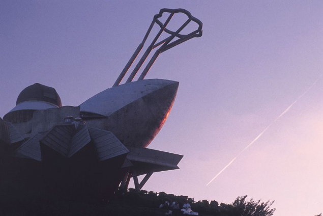 輝北天球館に夕日が射していた。飛行機雲の下には、近くの「星の家」という名のバンガローから出て夕餉をとる人がいた。天球館が建つ輝北うわば公園は、夏は涼しく蚊のいない避暑地である。四方が見渡せる絶景の地で、夜は満天に星が輝く。輝北町は環境庁から4年連続、日本一星空が美しい町に選ばれた。それを記念して平成7年(1995)高崎正治氏の設計で宇宙をイメージした輝北天球館が造られた。週末は夜10時まで、口径65センチの反射望遠鏡で宇宙を観察できる。