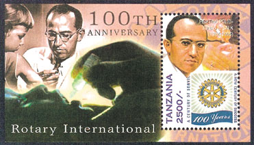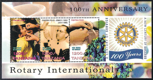国際ロータリー100年;ヨナス・ソークとロータリーのロゴマーク、100年の文字
