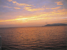 船の展望室もゆったりとして物静かな雰囲気だ。談話室もスタッフ付きでコーヒー・紅茶、ケーキの接待をして呉れる。(写真@)月の夜、星の夜はなんともいえない情緒がある。丁度満月だったので雲隠れする夜景を撮ってみた。(写真A)また豊後水道の夕焼けが綺麗だったので撮影した。(写真B)