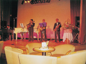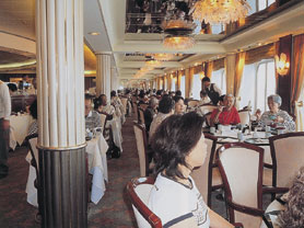 船の旅では食事が最高であるとよく言われる。飛鳥Uの食堂も頗る広く豪華だ。乗客は船室により2つの階に分けられる。献立も味付けも最高だ。上階船室の人は船長と一緒のテーブルにつく。時にはフォーマルな着衣を要求される。(写真C)場所を換えると寿司コーナーがあり海彦といって飛鳥Tより継続した板場さんも居てゆっくり出来る。劇場も映画館も一流だし、一日中何等かの催し物が絶えない。(写真Dは飛鳥Tの物だがUは随分広い)図書室、麻雀、囲碁室、浴場ラグジュアリーなども完備し10日位はアッと言う間に過ぎてしまう。