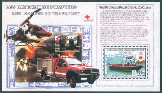切手に消防艇と灯台。シート地に救急車、消火活動する消防士、移送ヘリを描く