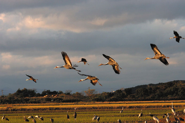 初冬の夕刻、雨があがって雲の隙間から西日が一瞬ぱっと照り鶴の着地の瞬間を撮るシャッターチャンスが訪れた。遠方にあって動く被写体なので撮るのはなかなかであるが、青空と棚引く雲をバックに羽を広げて着地する鶴の姿が撮れた。 (撮影場所:鹿児島県出水市荒崎)