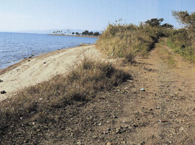 検校けんこう川に添って川口の方に行く。冬になると数百羽のカモの群れが集まって来るので、町の青年達が近くの藪に隠れて鉄砲で 「ズドーン」と打ち落とす、犬が泳いで獲りに行く、時には子供たちに獲りに行かせるものだった。面白いもので、鉄砲の音で一斉に飛び立った鴨の群れは暫くすると友達が撃たれたところにまた舞い戻って群れていた。不思議に思うものだった。しかし長閑な一日だった。その頃小さかったグミの木はもう私の背丈より大きくなっていた。ツバナを摘んで食べた思い出がある(ツバナ抜き)。(写真2)