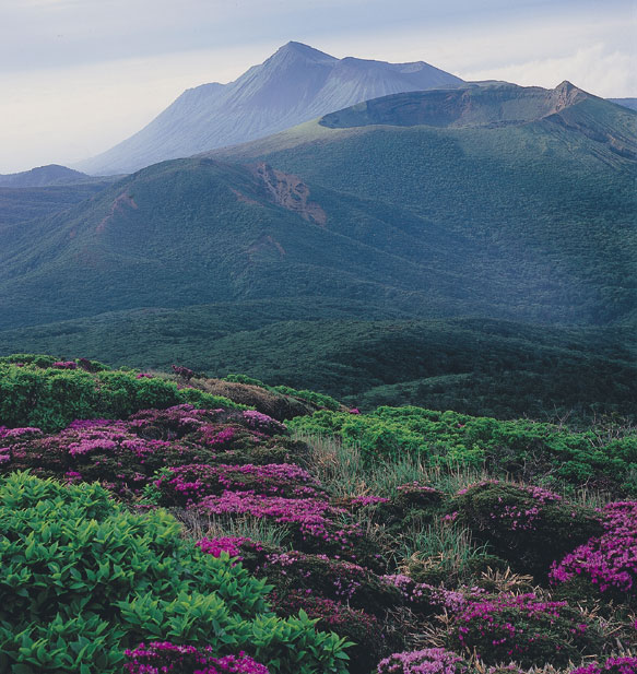 ミヤマキリシマの候 夜明けの韓国岳山頂附近よりの展望です。獅子戸岳・新燃岳・後方の端正な高千穂の峰の景観はいつ見ても新たな感動をおぼえます。