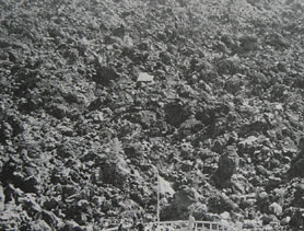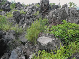 中学1年の時,博物の先生から「今の桜島に植物は何から育成し出すかは非常に興味のある所だ」といわれた事が何となく記憶に残っていた。当時,桜島は見渡す限り全くの真っ黒い溶岩原で,凹凸の激しい溶岩,奇石怪岩の広がりはまるで宇宙旅行の月面もかくやと思われる程だった(写真1,2)。その後戦中,戦後の70年を経て,先日久し振りに袴腰の月読神社の展望台に登って見渡した。あの溶岩群一帯は全くの松林の密林になっていた。あの時先生から折角良い暗示を戴きながら,若い私達は戦中,戦後の生活に追われ顧みる事が無く今日に到った。