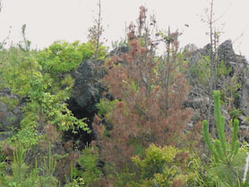 昭和30年ごろ南薩,大隅方面から県下,全国に松喰い虫の被害が甚だしい時期があった。全県下の昔からの街道筋に風情を添えていた松並木や磯から山川に至る海岸線の白砂青松もスッカリ枯れて茶褐色になっており非常に悲惨な状況だった(写真7)。しかし,不思議な事に桜島の大正溶岩地帯のクロマツ群には全くと言ってよいほど被害がなくて非常に不思議に思っていた。その原因については1)カミキリ虫が少ない 2)カミキリの線虫保有が少ない 3)島のクロマツは抵抗性が強い4)火山の灰やガスがカミキリの産卵を阻害する 5)クロマツの活力が高いなどの諸説がある。鹿児島大学の田川日出夫名誉教授は常緑樹を交えた適切な林相で有れば松喰い虫はこんなには繁殖しない,植生があまり松に偏りすぎて松喰い虫の栄養が豊富になって大発生したと考えられている(自然愛護:昭和50年3月)。しかし,平成10年頃になると桜島の松にも松喰い虫の被害が出始めた。なぜだろう,非常に不思議な事だった。